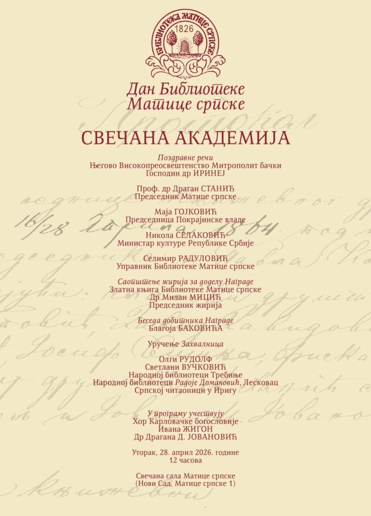 У уторак, 28. априла 2026. године, Библиотека Матице српске ће прославити свој дан. Свечана академија почеће у 12 часова, у Свечаној сали Матице српске.